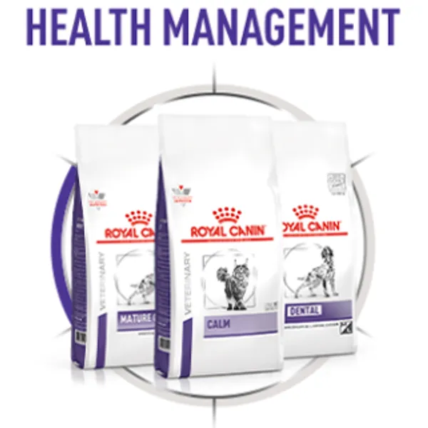 Health Management range—specialized nutrition designed to support your pet’s optimal health at every stage of life. This range addresses key health needs such as urinary health, dermatology, weight management, gastrointestinal care, and vital support, with a clear, easy-to-navigate purple color coding system that helps both veterinarians and pet owners identify the right products quickly. Whether your pet is undergoing neutering, dental care, or managing chronic conditions, these tailored formulas provide the nutritional support recommended by our veterinary team.