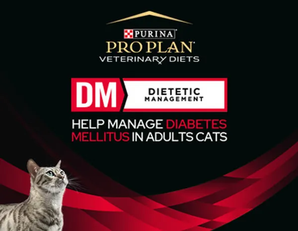 Purina Pro Plan Veterinary Diets DM Dietetic Management Feline Formula Dry Cat Food is high-protein and low-carb specially designed to support healthy glucose levels and promote lean body mass. With a healthy St/Ox defense, this kibble creates an unsuitable environment for the development of struvite and calcium oxalate crystals. It is also packed with antioxidants for immune support.